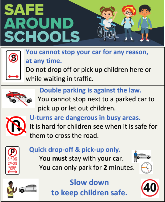 Please ensure you follow all road and safety rules when travelling to and from school. We appreciate your assistance.