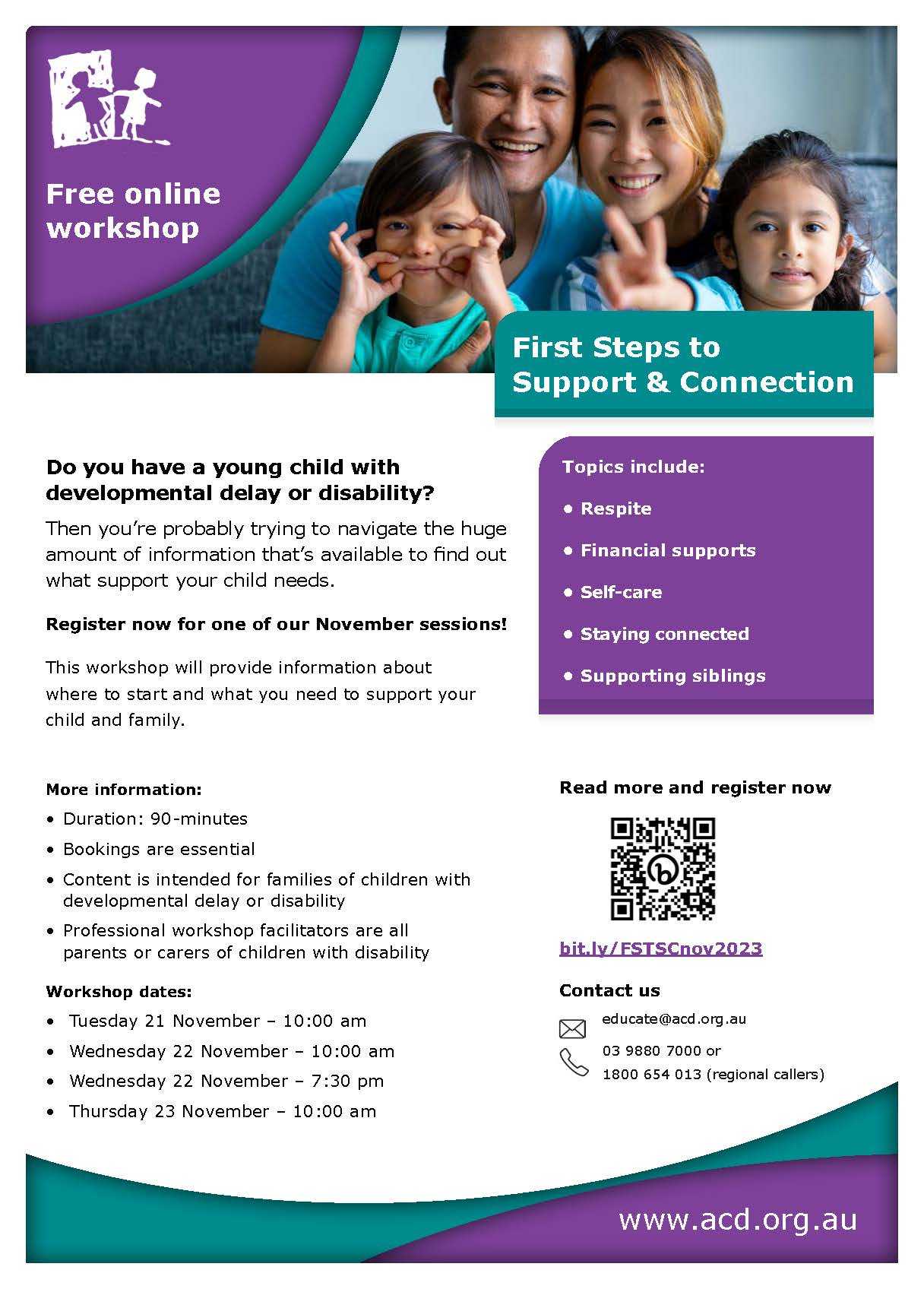 ACD runs over 100 free online and face-to-face workshops across Victoria each year, and our professional facilitators are all parents of children with disability. These free workshops enable families to connect, learn new skills, and get up-to-date information.