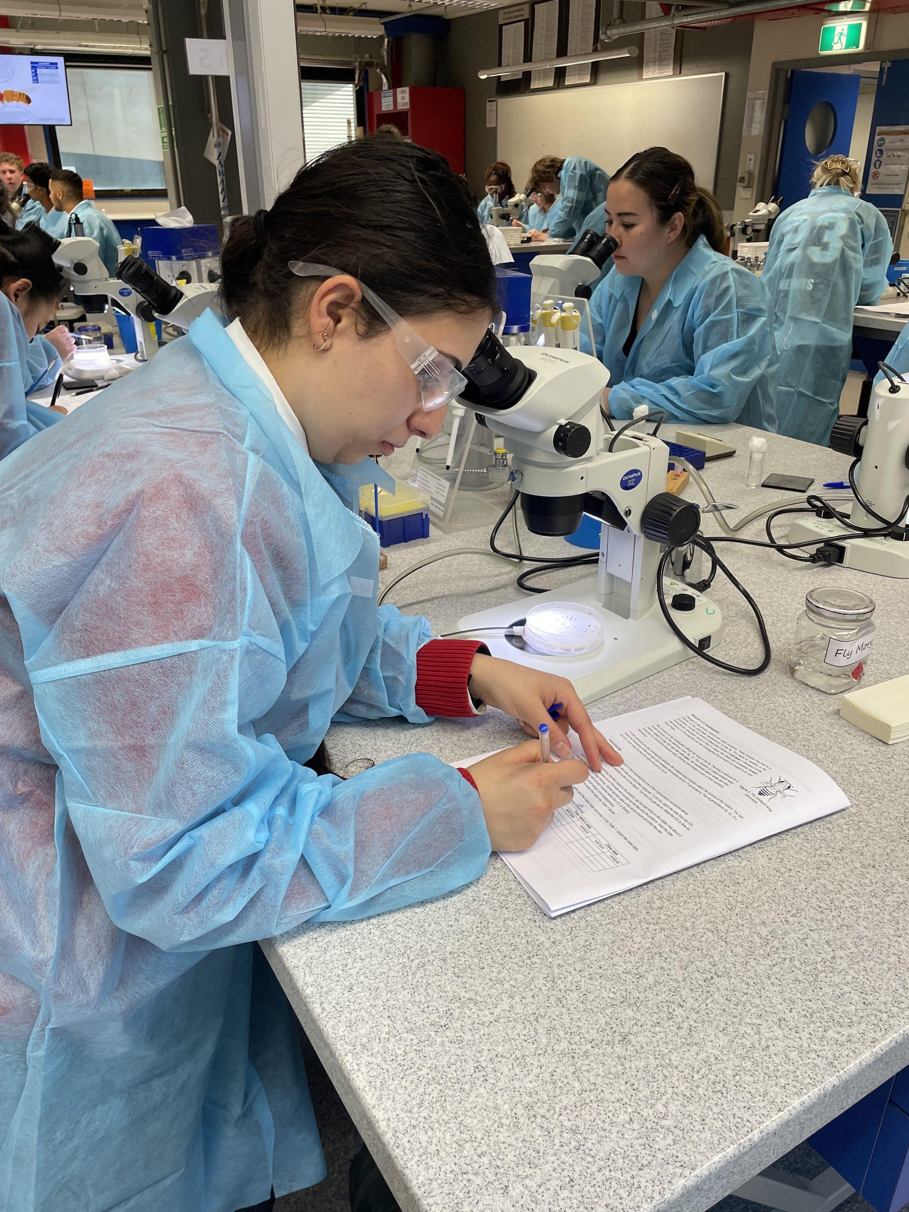 The Kolbe students worked in one of the School of Biosciences main laboratories where they first investigated the change in frequency of a particular allele (form of a gene) across 20 generations of the fruit fly, Drosophila melanogaster. Students were shown how to anesthetise the flies, then identify males from females and those with the gene under investigation. Students collated their data as a group to determine how the number of flies with the gene changed over time.