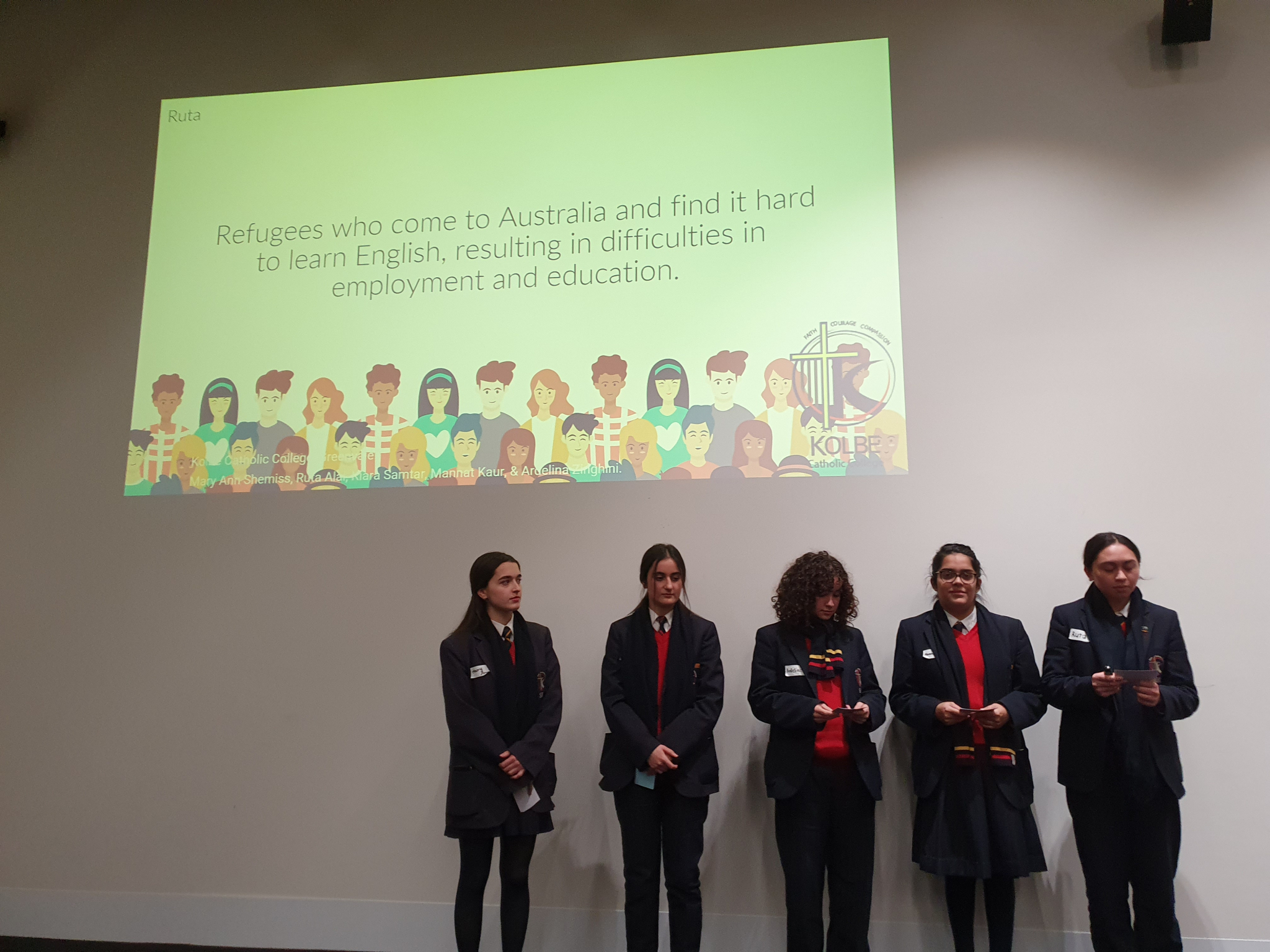 Kolbe Catholic College was able to send Ruta Alai, Mannat Kaur, Kiara Samtar, Mary Ann Shemiss and Ardelina Zinghini, captains and vice captains for Community, Wellbeing and Faith, to engage with like-minded students and present their ideas to community experts.