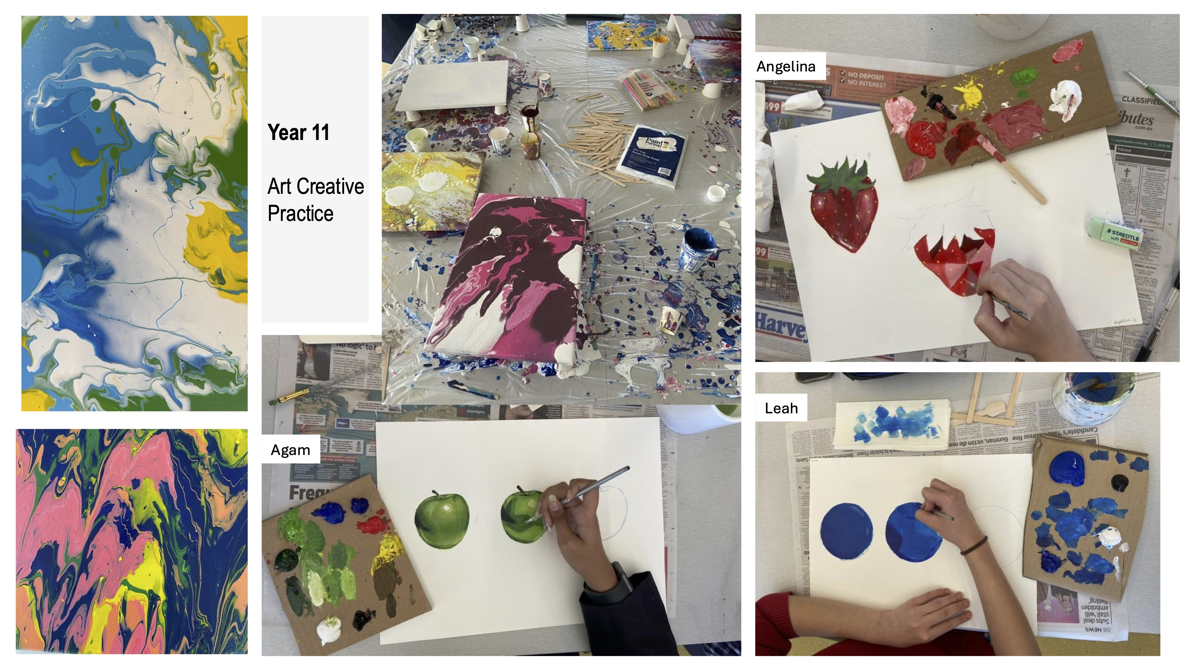 Our Year 11 students are currently exploring a variety of art forms, and we are excited to share some of their impressive work and works in progress, including painting techniques, as part of their ongoing artistic development.