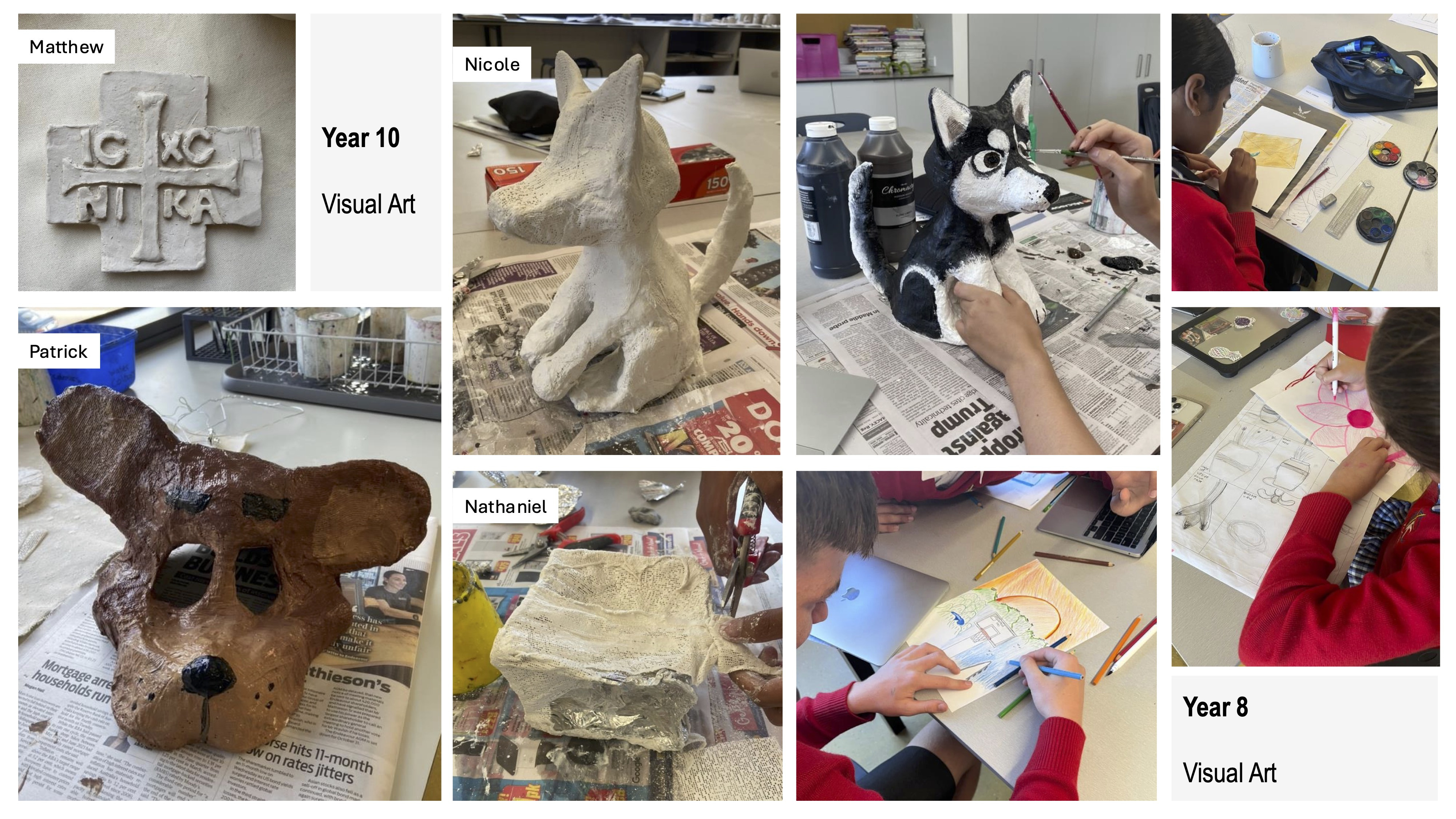 In the classroom, Year 8 students have been developing their drawing techniques and experimenting with collage to create artworks. Year 7 students have been introduced to the exciting world of printmaking, using the printing press to create their own original compositions. Year 9 students have delved into digital drawing through Photoshop, exploring new ways to develop their ideas and create artworks. Year 10 students have been immersed in the wonders of ceramics, with their pieces set to be fired at a local kiln, while also experimenting with sculptural processes to create impressive three-dimensional forms.